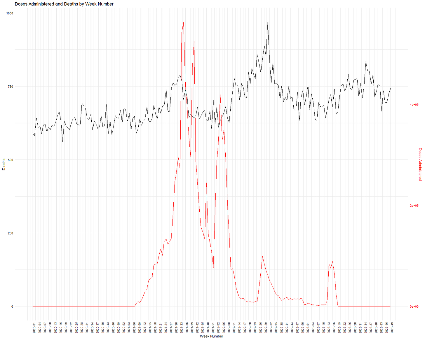 None of that appears to have any relation to the “MOAR” data… But never-mind again, I reproduced it, picking the New Zealand’s official deaths10 11 & doses injected12 13, as I certainly wouldn’t just take Steve’s word for it.