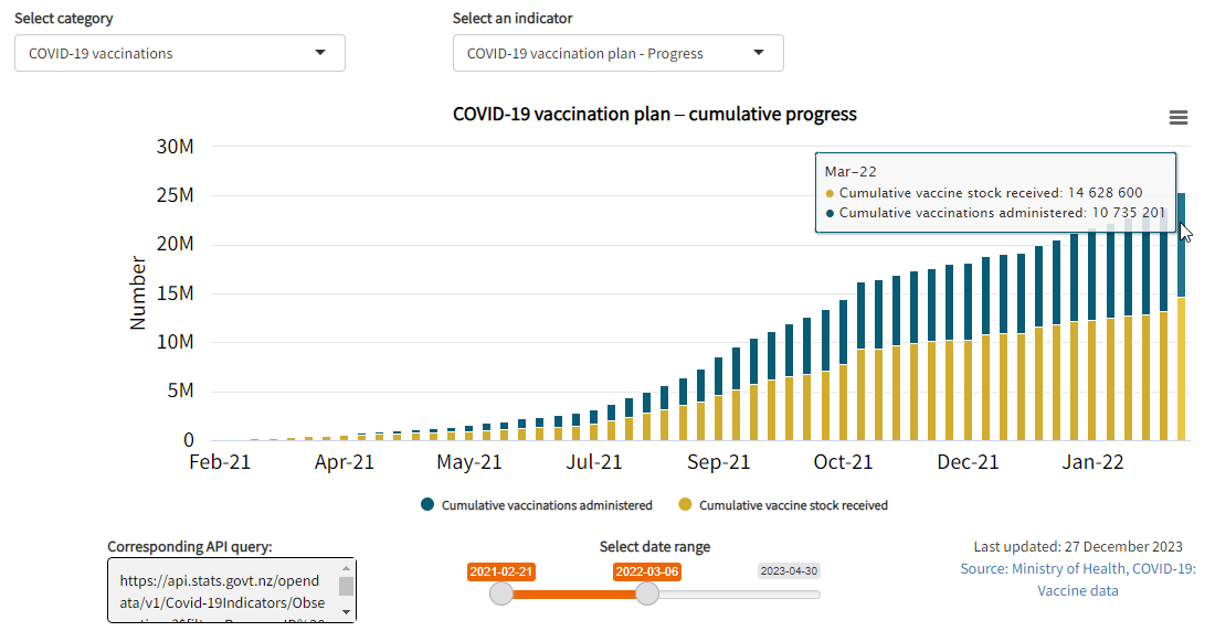 By chance, the NZ source we’re using also has the historic cases data18 19, which we can add to another visualization effortlessly.