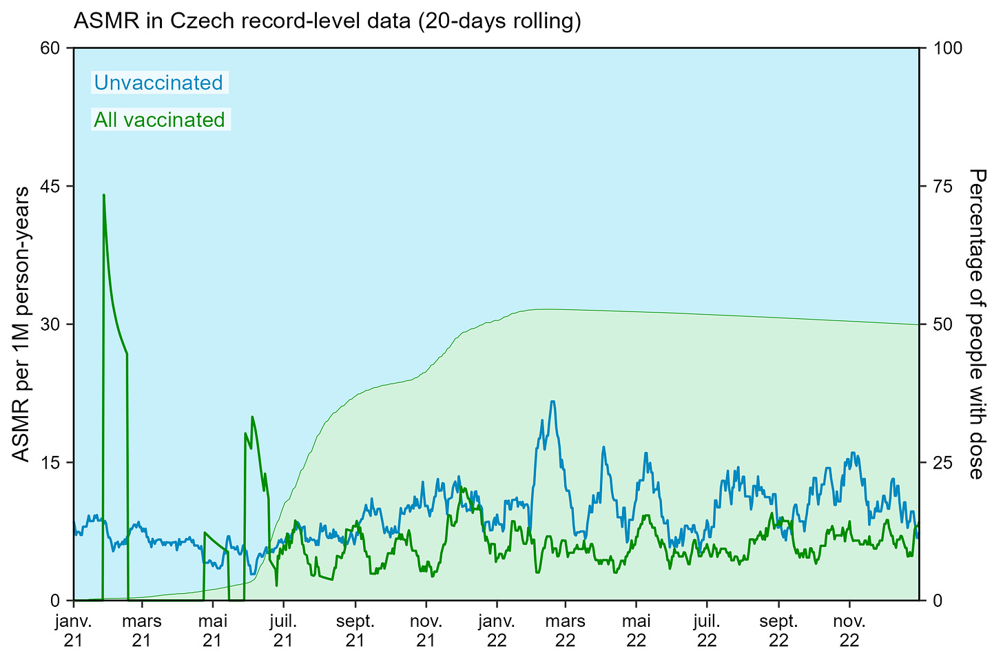 Dr Ah Kahn Syed (to whom the credit of a good part of the interesting findings developed here is due) & myself analyzed this data & decided to postpone our current 8 pages of data consistency analytics & subsequent demonstrations, while waiting for the publication of the official CZ dataset - announced soon to come by UZIS, their statistical office. Shortly explained (we will briefly expand on that below), the current dataset is riddled with flaws & unknown confounders, and shouldn’t be used to draw conclusions - but merely to demonstrate how poor the observational data used is, in general.