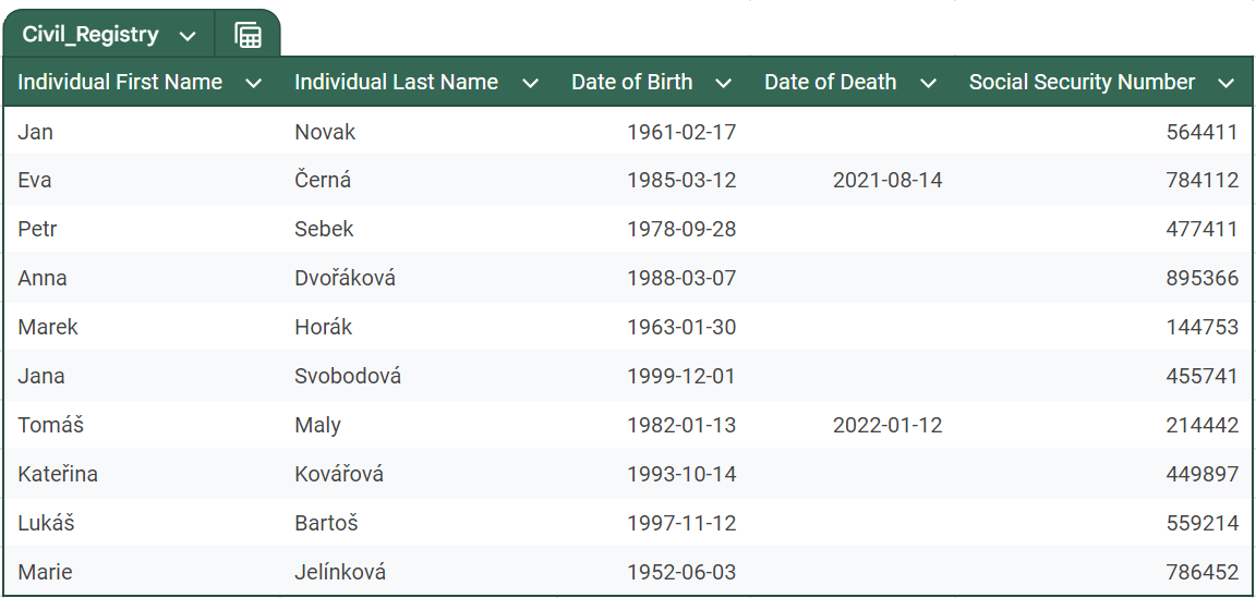 He will then, looking for the subject on the basis of the name & date of birth, easily find Jana Svobodová. At this stage, he will be left with only one record, non-matched, who died.