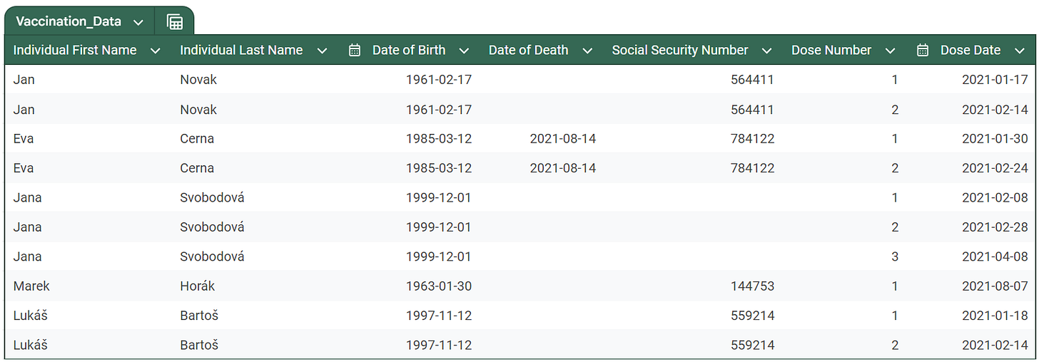 - Eva Černá is named Eva Cerna in the vaccination database, and has a social security number error