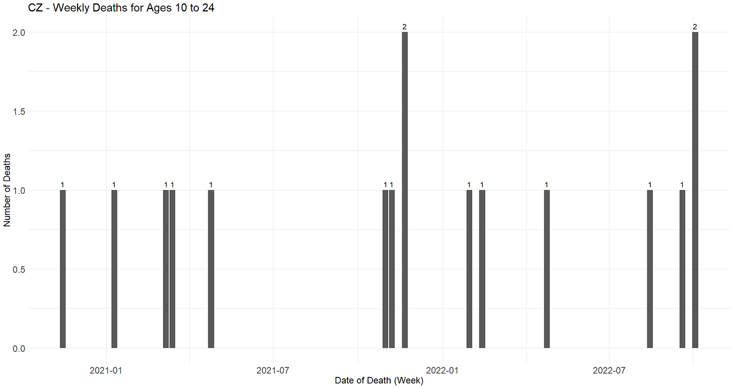 The Czech Republic keeps on its statistical platform a file containing all the COVID deaths registered within the state during the pandemic, with date of death, age, and sex31. This allows us to represent that during the course of the pandemic, 16 COVID deaths occurred in the 10 to 24 age group (R32).