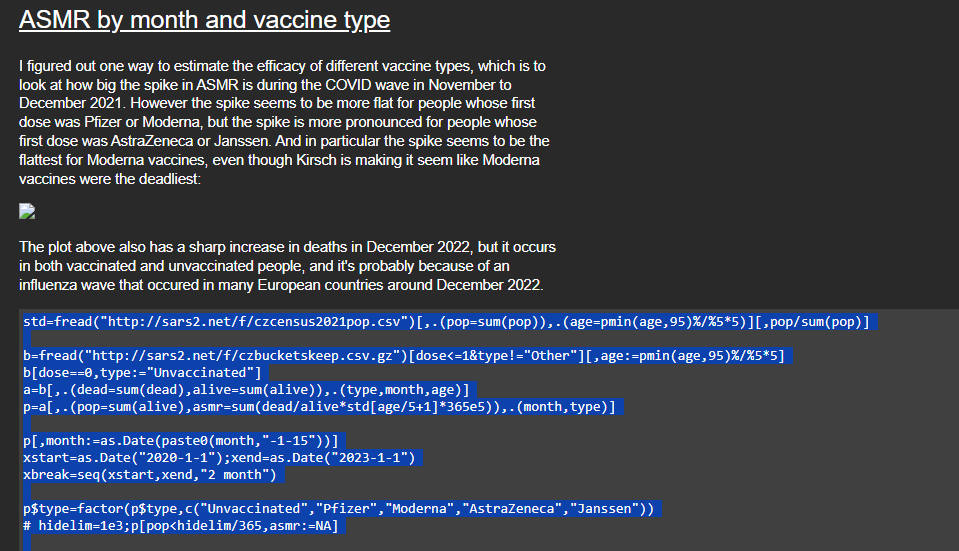 In the course of our own analytics, I realized with surprise, painfully re-reading his non-commented and non-indented code, that what he called "ASMR"4 (Age Standardized Mortality Rate) was using a flawed rating system, not a true age-standardized rate as it should be. ASMR involves taking a population with a known mortality rate in each 5-year age band, which gives a crude mortality rate for the whole population. You then recalculate the overall mortality rate, assuming those same age bands maintain their mortality rate, but you use the population distribution from the "standard" population to recalculate the overall mortality of your population. It is a specific method to control for different age distributions among populations or over time, which, by definition, involves the use of a "standardized" population. Yet, at this time, the page explained that the following was an ASMR without any reference population being loaded, which was rather surprising.