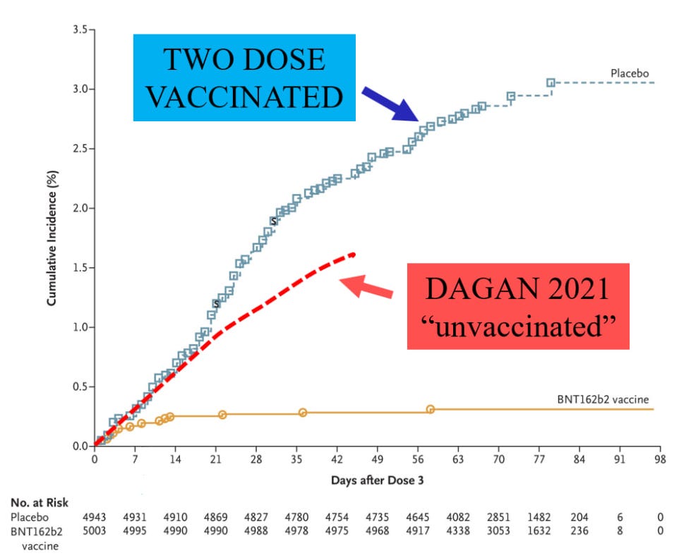 - Dagan et al., 2021, published on February 4, 20214, which was looking at the period from December 20, 2020, to February 1, 2021, on unvaccinated versus at least one dose.