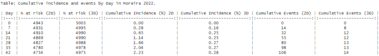 We can compare the infection rates at 0 (Dagan 2021), 3 doses (Magen 2022), and the advertised 2 doses vs 3 doses efficacy (Moreira et al., 202215). The latter figures were provided in the Figure 3 “Cumulative Incidence of Covid-19 after a Third Dose of BNT162b2.” an another study reporting on a “randomized clinical trial” commissioned by Pfizer & BioNTech, pulling the traditional “central laboratory” trick16. Impressive efficacy against infection (again):
