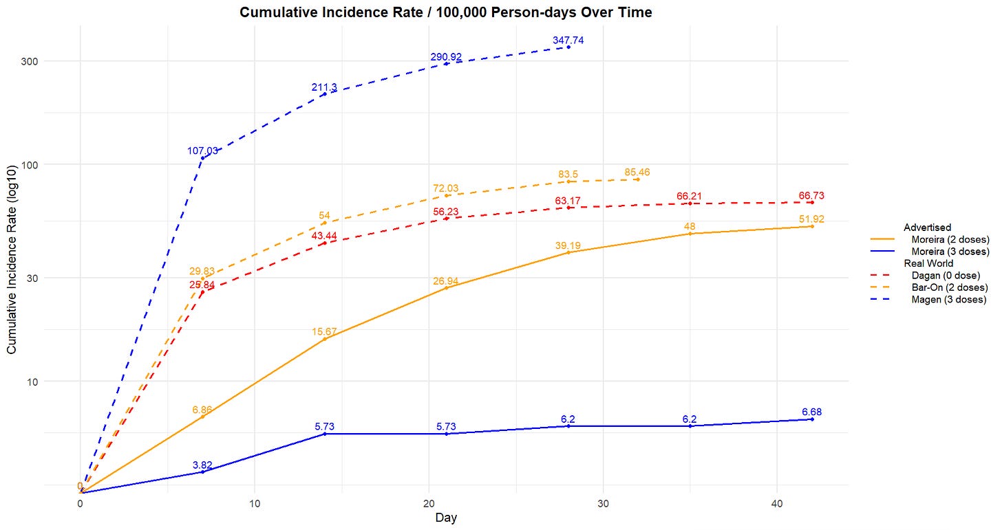 The following chart therefore compares the Incidence Rates observed in “real life” (according Israel’s own studies) for the “underdog” of each study (dashed) - against Moreira’s advertised results (continuous).