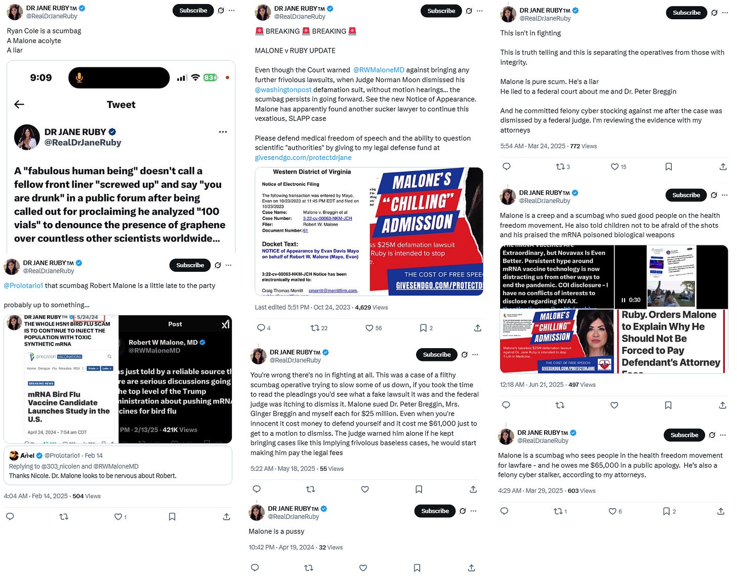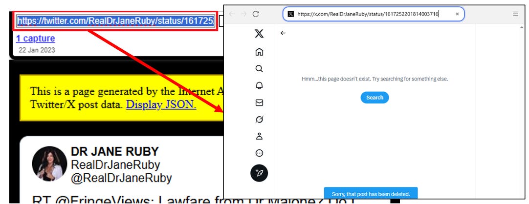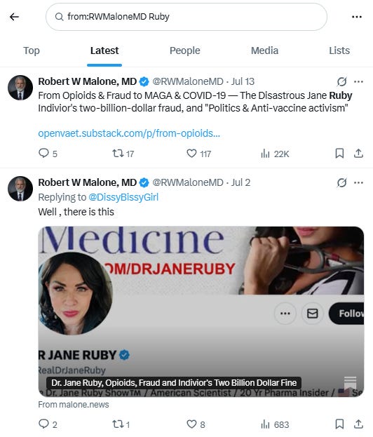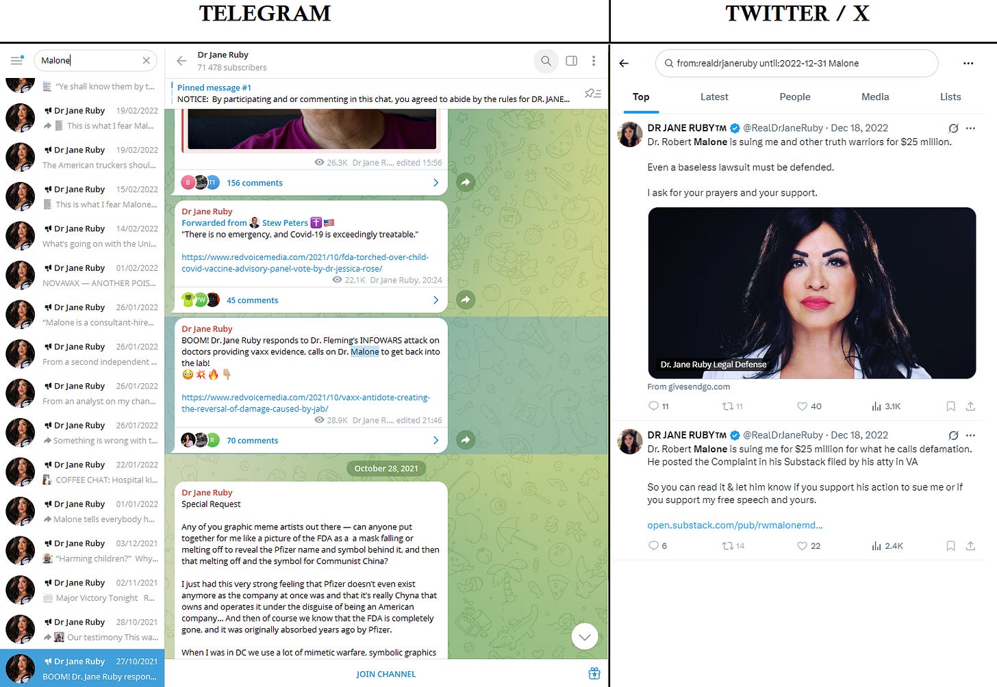 - Jane Ruby insists her troubles with Dr Malone began when - out of the blue - he sued her for $25 million. Conveniently forgotten: Robert Malone filed in October 2022, after she had been attacking him since at least October 202116. True to form, she has scrubbed her X timeline so “Malone” barely appears before 202317, while her Telegram chat18 (archived19) is still riddled with attacks. She even alludes to the purge in her video’s first segment (00:06:38 to 00:06:43: “the links didn’t go anywhere”). The screenshots below - X on the right, Telegram on the left - speak for themselves.