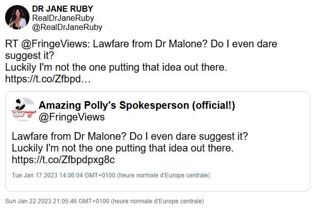 Well, fortunately for those skeptics, we have a wonderful tool called archive.org. What happens when we search Jane’s tweets20 from that period…? For example, we find.. This post21, relaying “Amazing Polly” (another figure we came across because she was attacking medical freedom activists - and who would be worthy of a full portrait22).