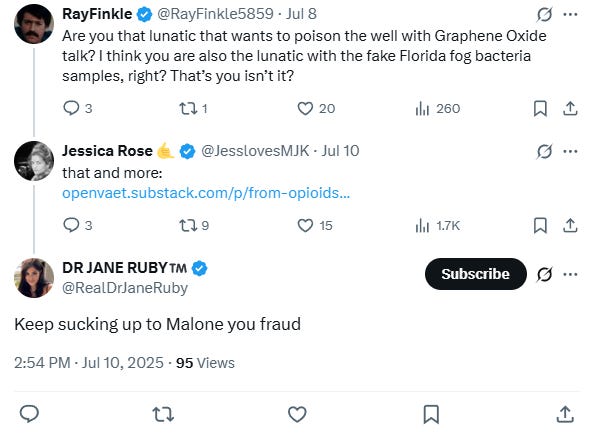 As Jane Ruby herself admits, “his word commands a lot of attention” - and that likely torpedoed the ex‑Pfizer bros’ brilliant containment effort: every one of those self‑proclaimed (and thoroughly useless) “medical‑freedom leaders” has vanished from the thread since.