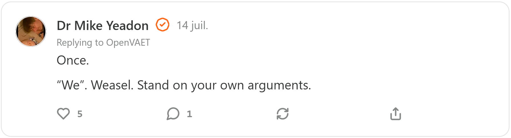 Broken Truth’s John Davidson found the same thing4 when Yeadon slandered his documentary “Epidemic of Fraud”5 without even watching it: Yeadon talks with great confidence about subjects he knows nothing about.