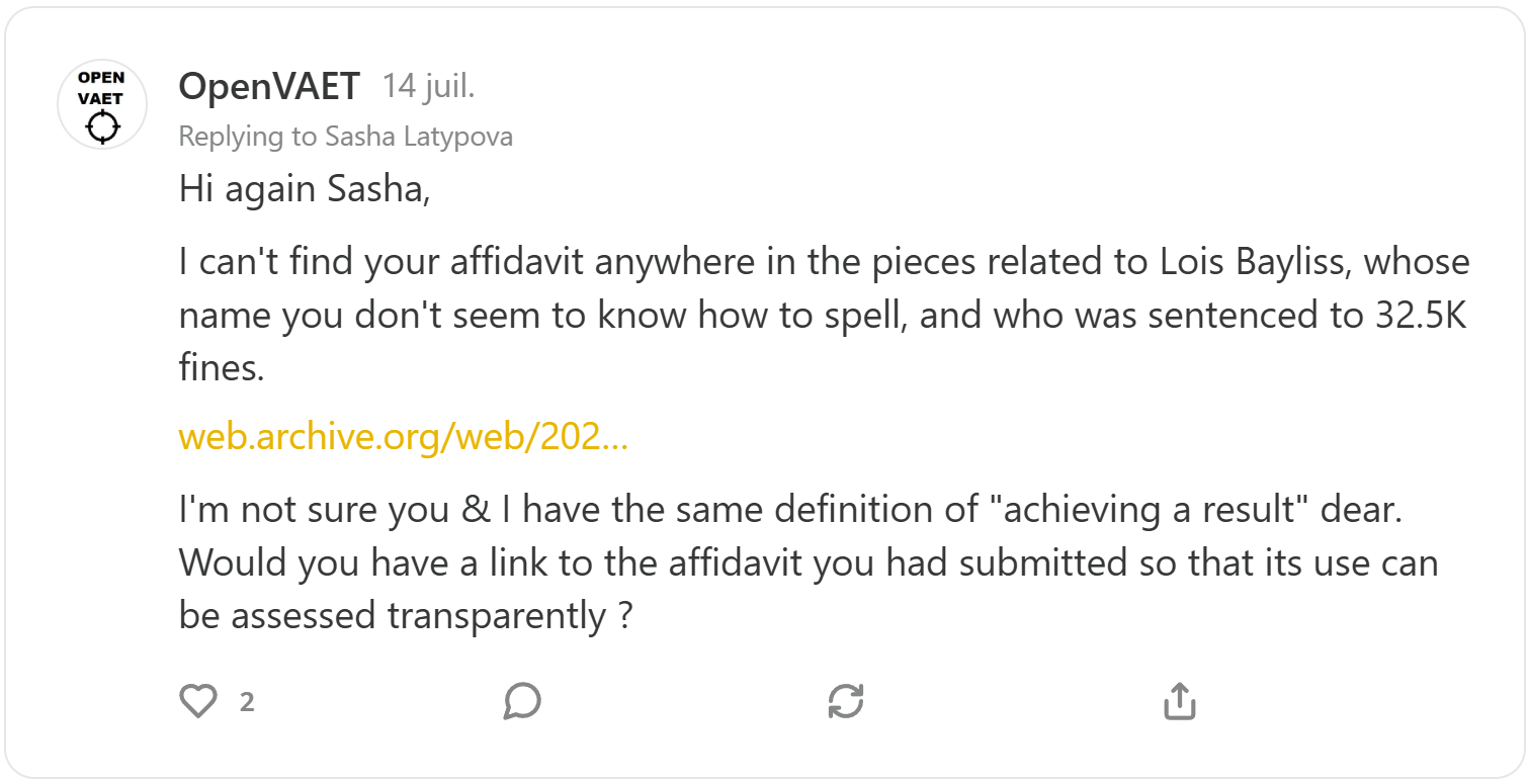 See the link below for Sasha’s refusal to supply an affidavit or any proof of her alleged “victory” in the “Louis Bayliss” case (Lois Bayliss was fined £32.5 k, and after verifying, Sasha, who couldn’t even spell her name, contributed nothing2).