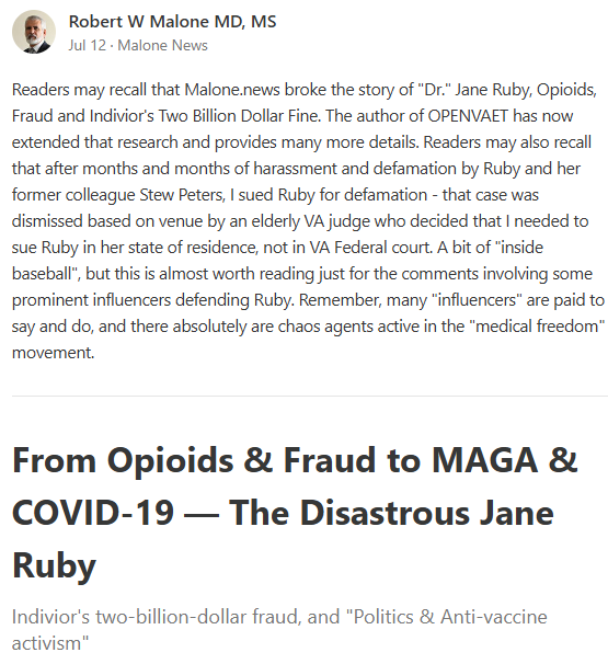 As I write this, 360 comments have piled up, and I’ve watched Jane’s old friends, the ex‑Pfizer bros Yeadon & Latypova, fumble through the crisis as if they were following a step‑by‑step guide on what not to do - making this the perfect moment for a live case study of chaos agents in action. And although the previous article had nothing to do with Robert W Malone MD, MS, Jane and her friends insist on making him the centerpiece of their counter‑attack - so we’ve also taken a look at the material facts of the “Malone v. Ruby” case, which we’ll lay out so readers can judge for themselves.