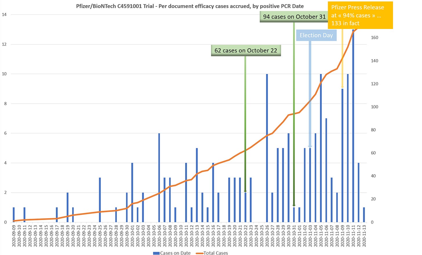 According to Pfizer's documents8, 62 efficacy cases required for the interim analysis had been validated at Pfizer's Pearl River central laboratory by October 229. However, Pfizer delayed the announcement for 19 days, and by November 9, they had 133 cases. They could have announced the efficacy and given Trump a political victory, but they didn't.
