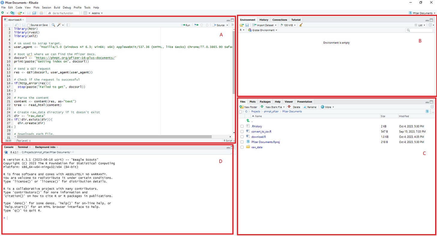 2. Open “Pfizer Documents.Rproj” with R Studio (a simple double click on it should suffice).