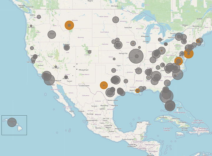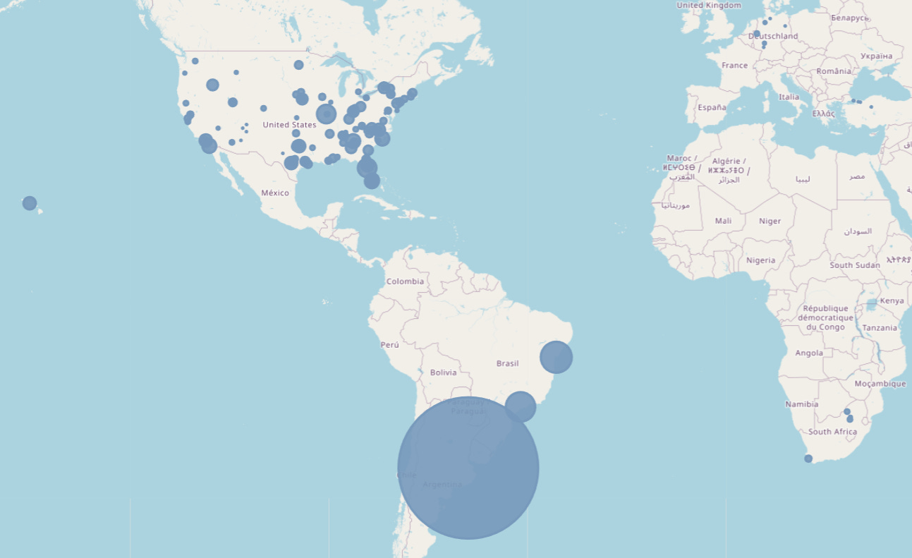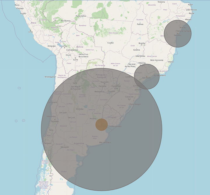 We can make it clearer by looking at another map focused on US & South America (European, Turkish & South African sites have no interest here), with a scale of 2500 meters per exclusion & 250 meters for each subject screened (making the orange circle - the exclusions - bigger than the grey circle - the screened subjects - when the site has excluded 10% or more of its screened subjects).