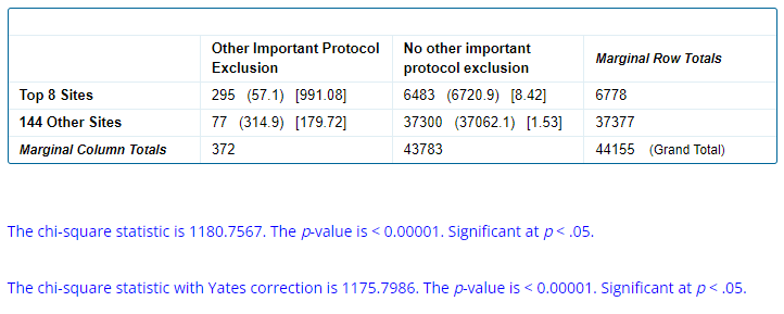 These 8 sites account for 295 of the 372 "other important protocol deviations" exclusions (79.3%) with 6 778 subjects (15.35% of 44 155).