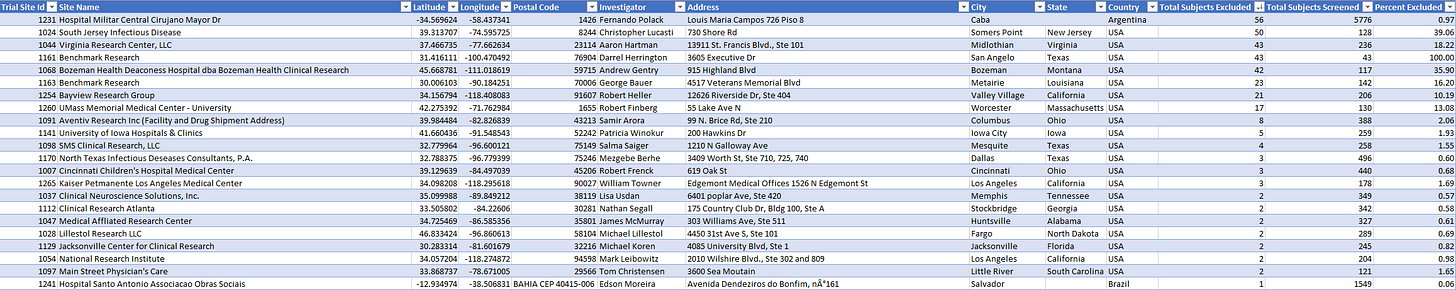 - Site 1044, Virginia Research Center, LLC (Midlothian, Virginia), Principal Investigator Aaron Hartman, 43 exclusions, 18.22% of its 236 subjects.