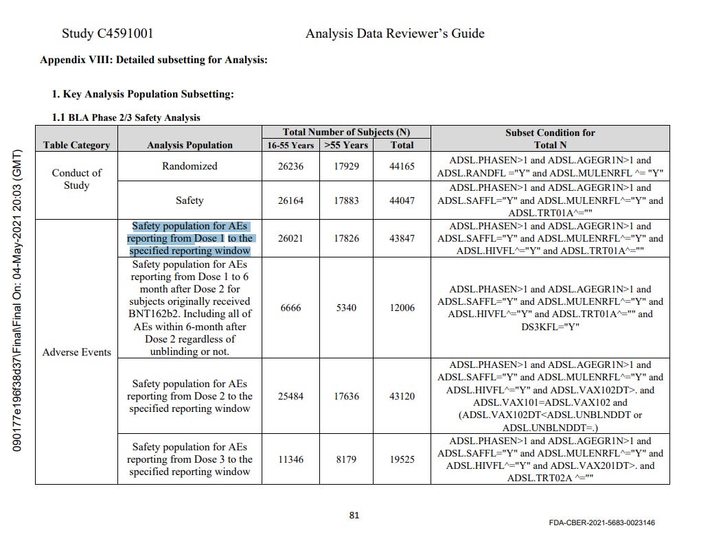 The Analyst Data Reviewer Guide (ADRG)7 provided by Pfizer to the FDA defines the safety population as follows, page 81, and reports 43 847 subjects.