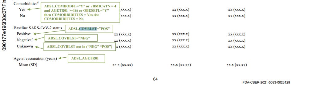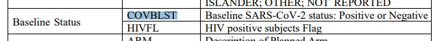 Page 12 states that “ADSL.COVBLST” - the tag in the subject level data set to “POS” indicating if the subject had Covid or not at dose 1… has two possible statuses (Positive or Negative)…