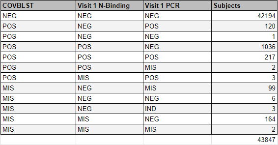 The distribution of the possible values for V1 N-Binding, PCR, and COVBLST status, is represented in the table below. The visit 1 tests are merged and normalized using this second script; and the distribution on the safety population, along with the subsequent analysis, are generated by this third.