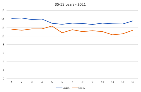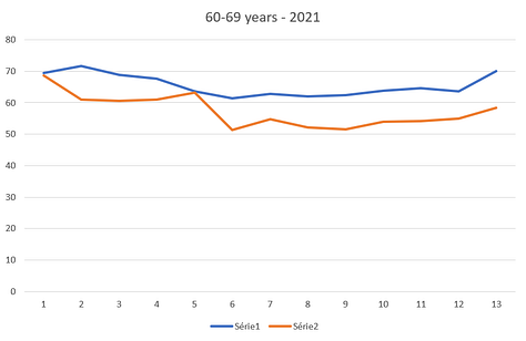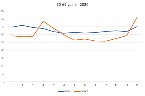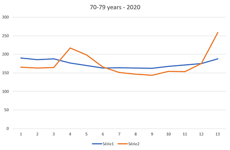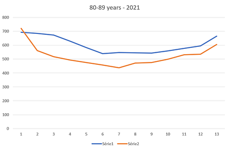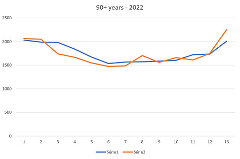 We grouped the 52-53 weeks of deaths data, available on each year, in 13 groups of 4 weeks (a fifth was included in “week group 13” when 53 weeks in a year), and measured the z-score on each variation in deaths of 2020, 2021 & 2022 against the 2010-2019 baselines.