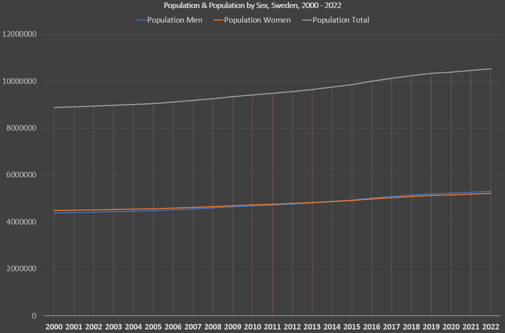 The overall population (total & by sex), births & deaths, are represented in the following table & chart from 2000 to 2022, and can be downloaded on this Google Spreadsheet12. It paints the picture of a nice and steady growth of the Swedish population.
