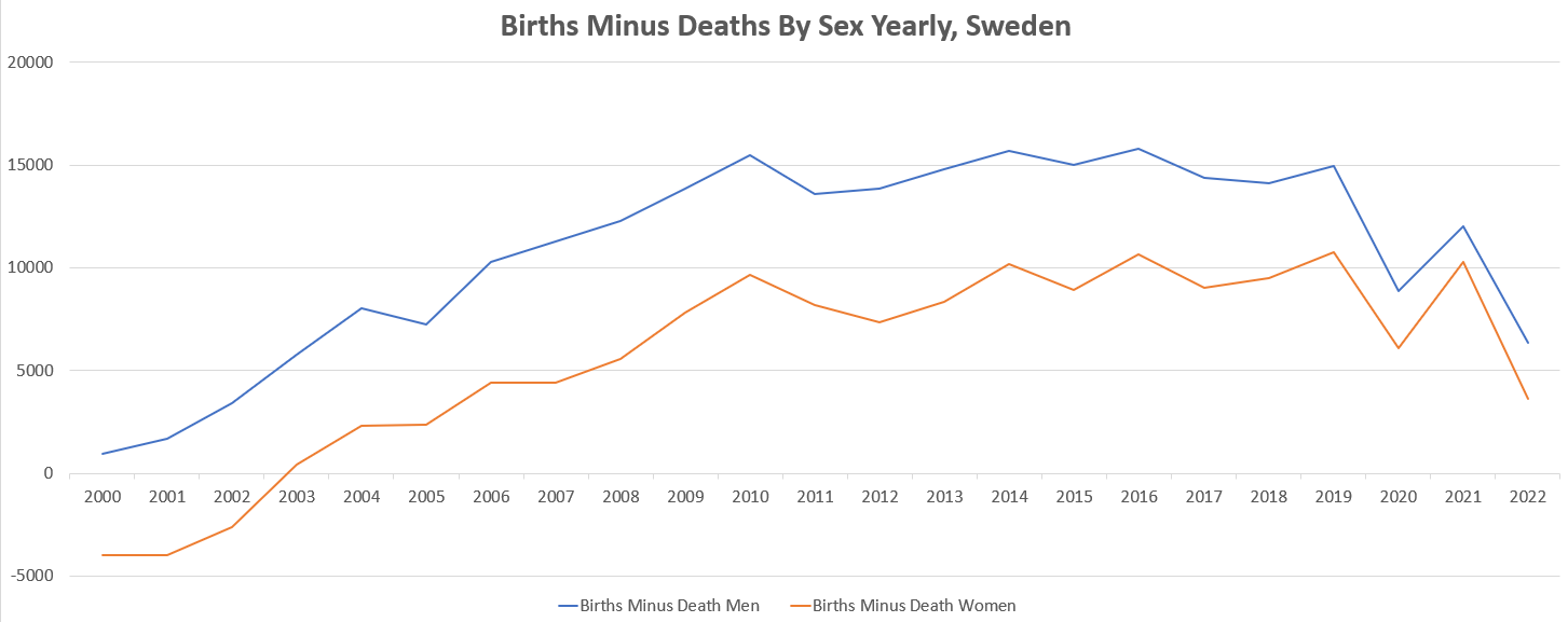 Charting the total of births minus deaths each year (natural growth), by sex, we can observe with horror that the Swedish women were on a negative trend in 2000, which luckily reversed in 2003.