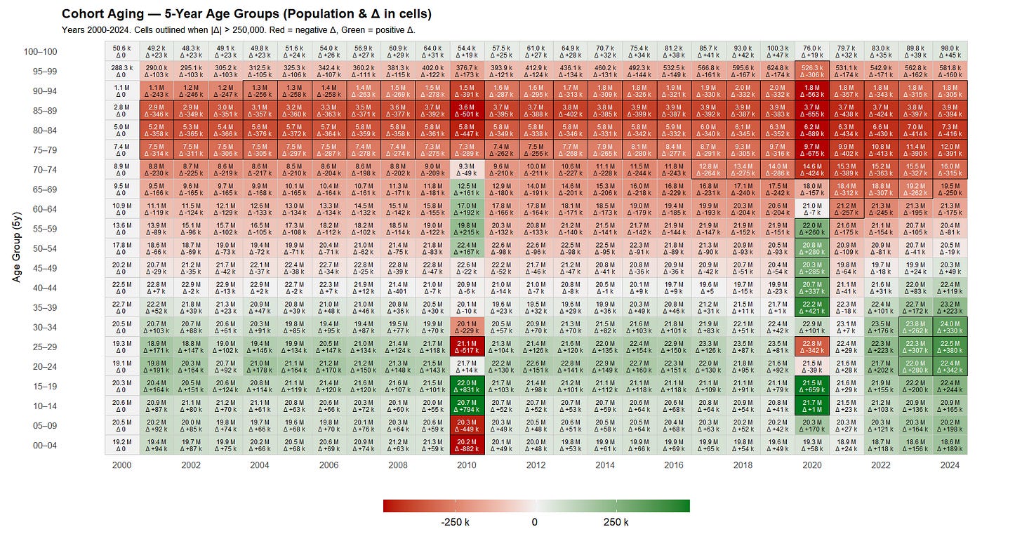 Examining the same phenomenon by more readable 5-year age groups over 2000-2025 yields a complementary picture, this time highlighting only offsets up to 250,000 or more (R).