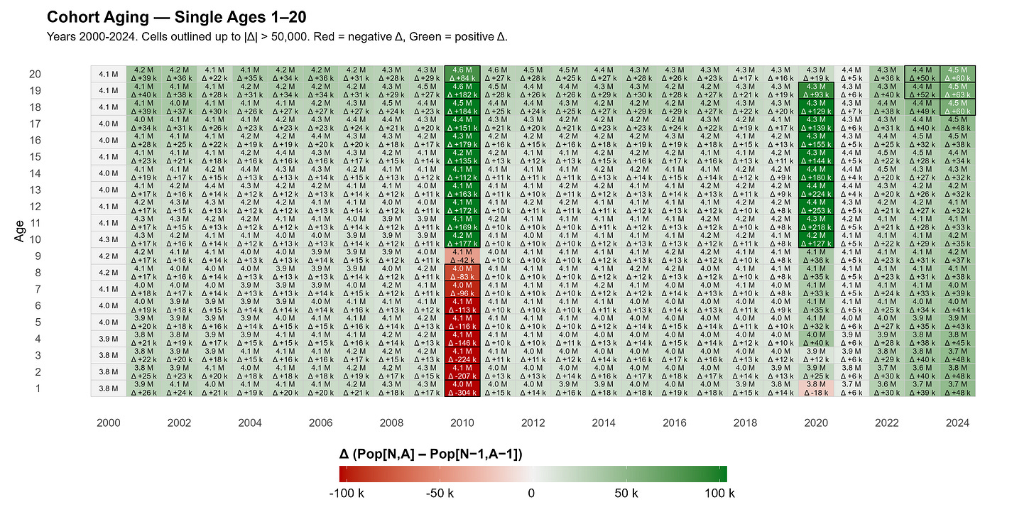 In the meantime - since no such revised estimates are available from the Census Bureau - we apply our own smoothing (R), distributing the 2020 discontinuities evenly across 2011-2019. Because the census was conducted during the pandemic year and older ages are less affected by migration-driven shifts, we limit the smoothing to age 59 and under. The resulting dataset (see CSV) yields far more consistent year-over-year cohort aging relative to the 2020 census (R).