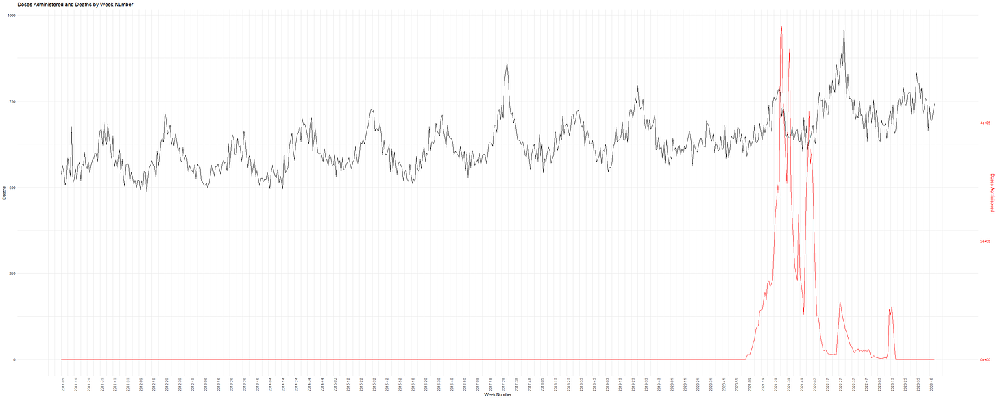 None of that appears to have any relation to the “MOAR” data… But never-mind again, I reproduced it, picking the New Zealand’s official deaths10 11 & doses injected12 13, as I certainly wouldn’t just take Steve’s word for it.