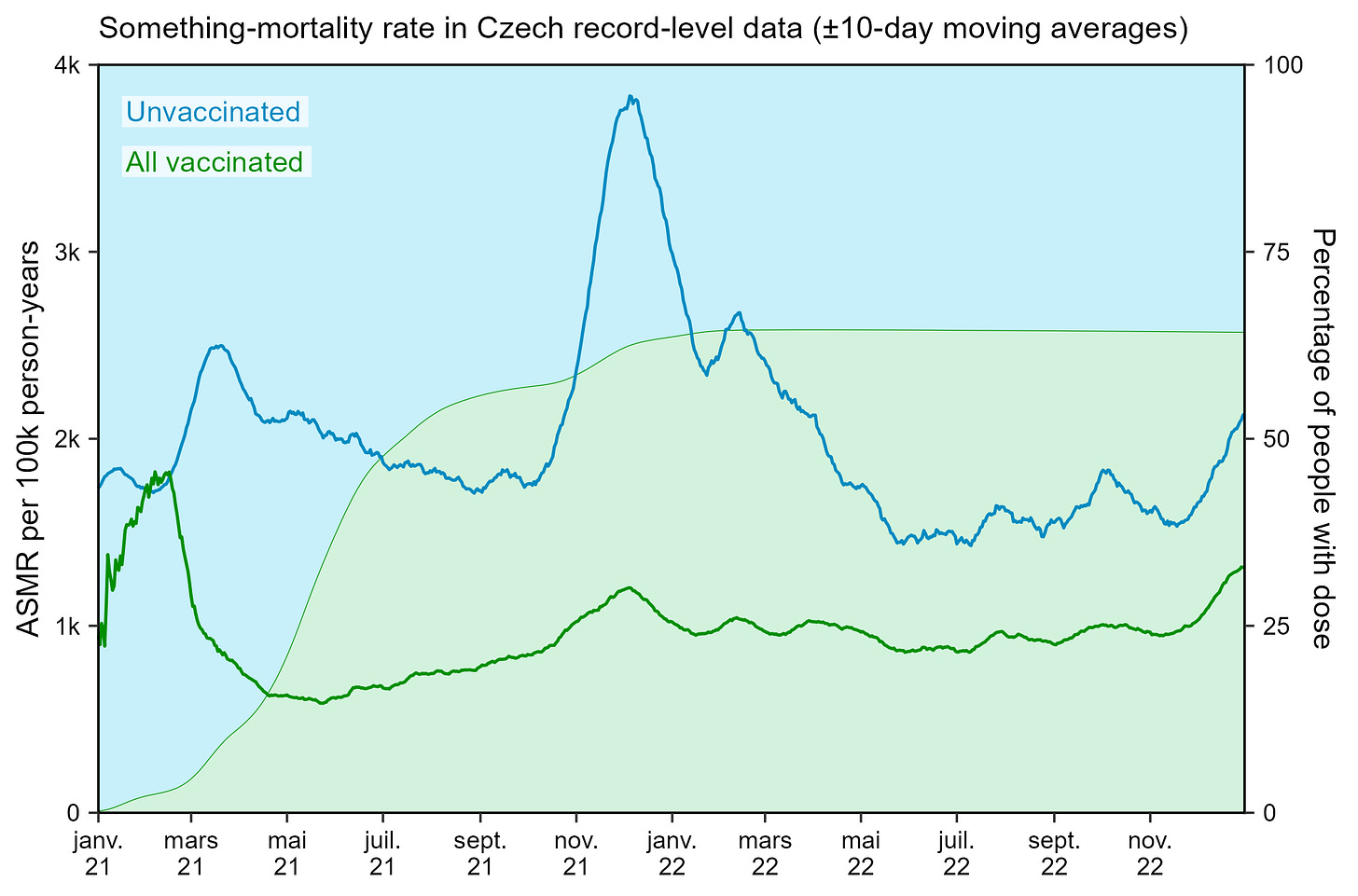 First, ASMR, like the Mongol-thing first described, are both integrating infant deaths by default - which will constitute the bulk of almost fully unvaccinated deaths under 12 - weighting on the groups balance.