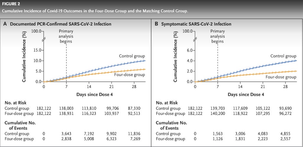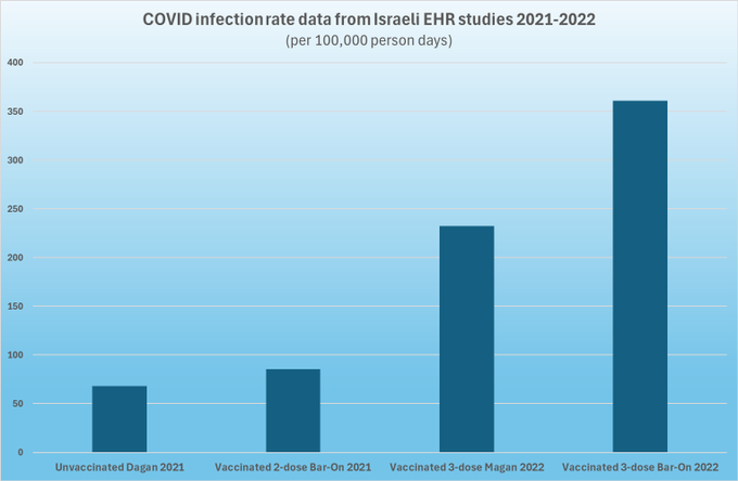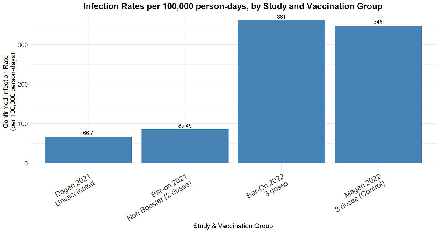 The same goes for Bar-On 2022, from January 10 through March 2, 2022, which provides directly, in its section “Protection Conferred by the Fourth Dose” a raw infection rate among the “Three-dose group” of a whopping 361 cases per 100,000 person-days.