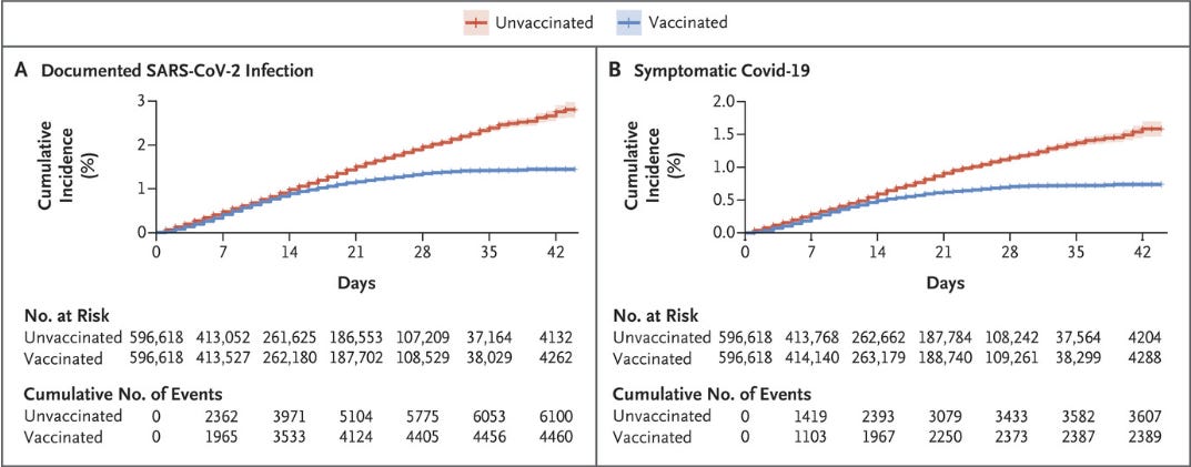 - Dagan et al., 2021, published on February 4, 20214, which was looking at the period from December 20, 2020, to February 1, 2021, on unvaccinated versus at least one dose.