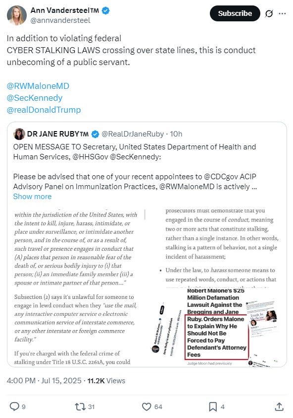 Jane Ruby - after conferring with her lawyers and weighing her options - responded with a fairly hilarious sequence. She began by posting an open letter9 to HHS Secretary Robert F. Kennedy, Jr.. High‑visibility accounts - Ann Vandersteel10 among them - immediately amplified the post, perhaps to signal us that they belong to the same network, or abused by Jane’s gaslighting…