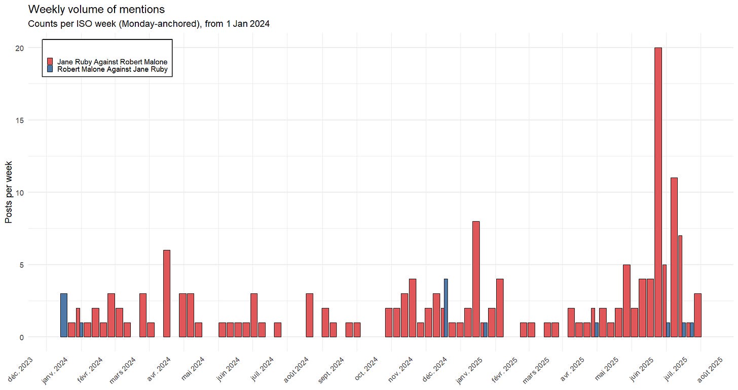 - A similar check of Robert Malone’s archive.org timeline shows no deletions. But because Jane has deleted an unknown number of past attacks - and because Archive.org is far from exhaustive - we need to ground the discussion in hard numbers comparing them on a period which Jane won’t have cleaned. Despite Jane’s deletions, there are still 217 posts in which Jane Ruby mentions “Malone”23 and 19 posts in which Robert Malone mentions “Ruby” since 2021,24 all collected with their URLs and dates in a .CSV file25.