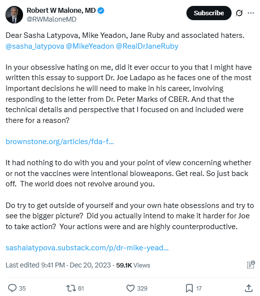 As I write this, 360 comments have piled up, and I’ve watched Jane’s old friends, the ex‑Pfizer bros Yeadon & Latypova, fumble through the crisis as if they were following a step‑by‑step guide on what not to do - making this the perfect moment for a live case study of chaos agents in action. And although the previous article had nothing to do with Robert W Malone MD, MS, Jane and her friends insist on making him the centerpiece of their counter‑attack - so we’ve also taken a look at the material facts of the “Malone v. Ruby” case, which we’ll lay out so readers can judge for themselves.