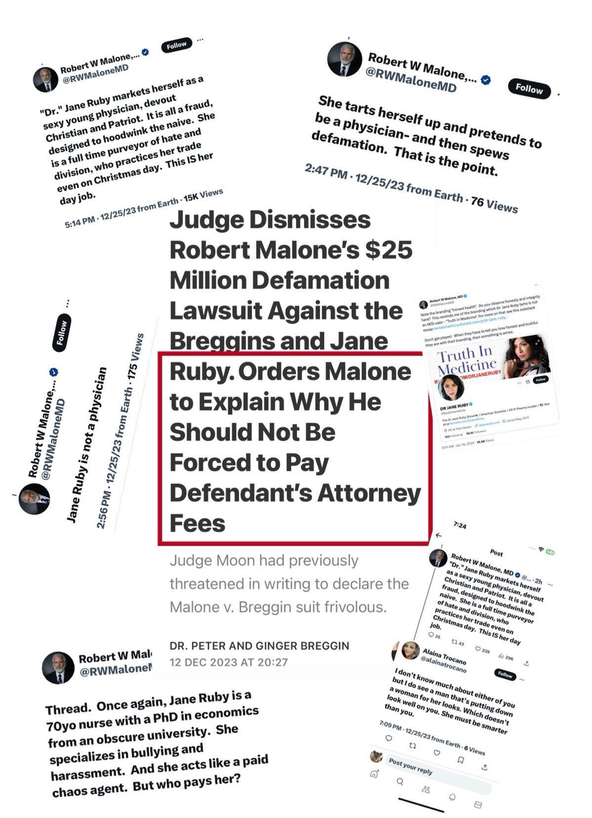 - 6. Robert Malone filed a SLAPP12 suit to silence her; at the hearing, she notes, “the links [meant to prove her guilt] didn't go anywhere”.