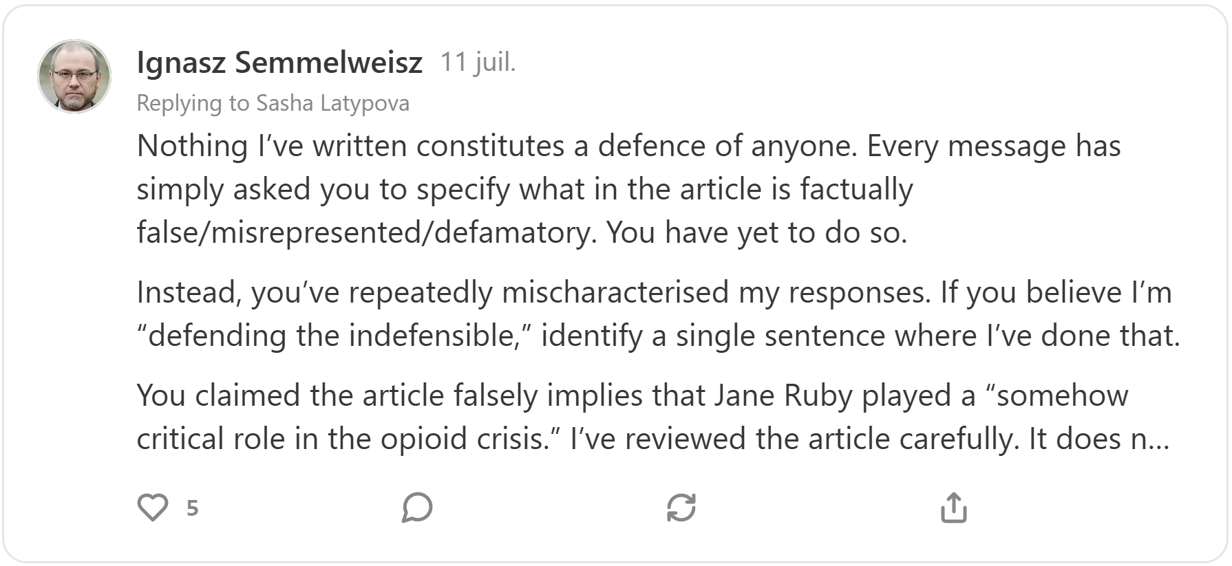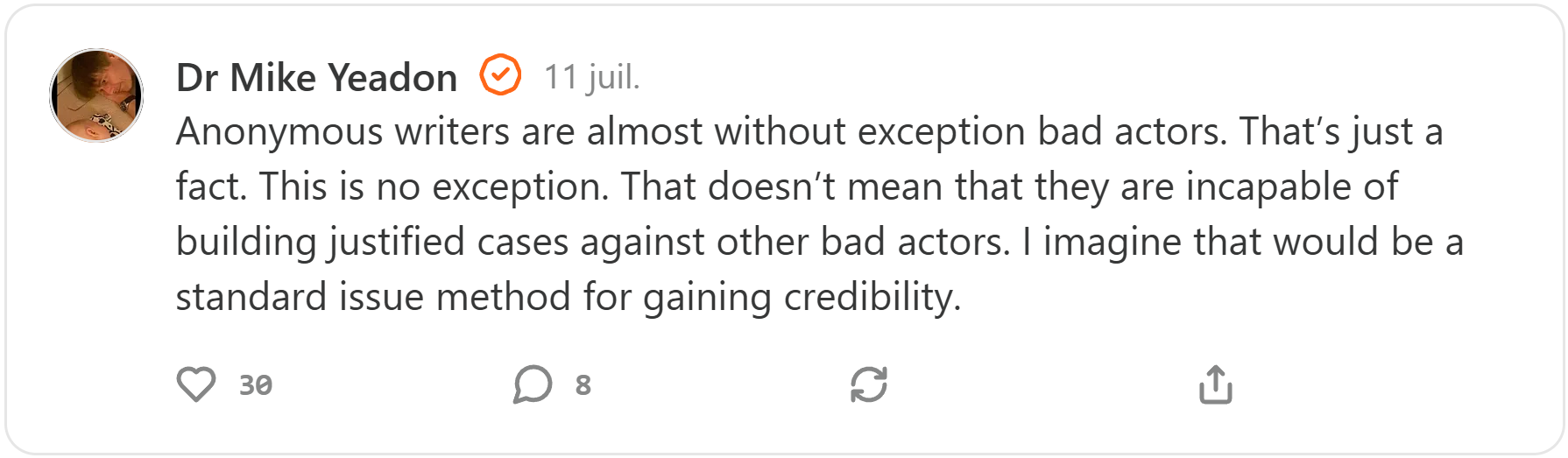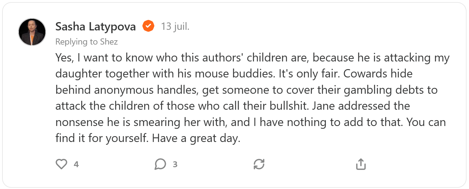 Having worked on real stalkers - people who pursue their victims with thousands of messages - I find her harassment claim insulting to actual victims. And why did Jane fail to mention the post from a few days ago14, the very one that triggered her ridiculous counter‑attack?