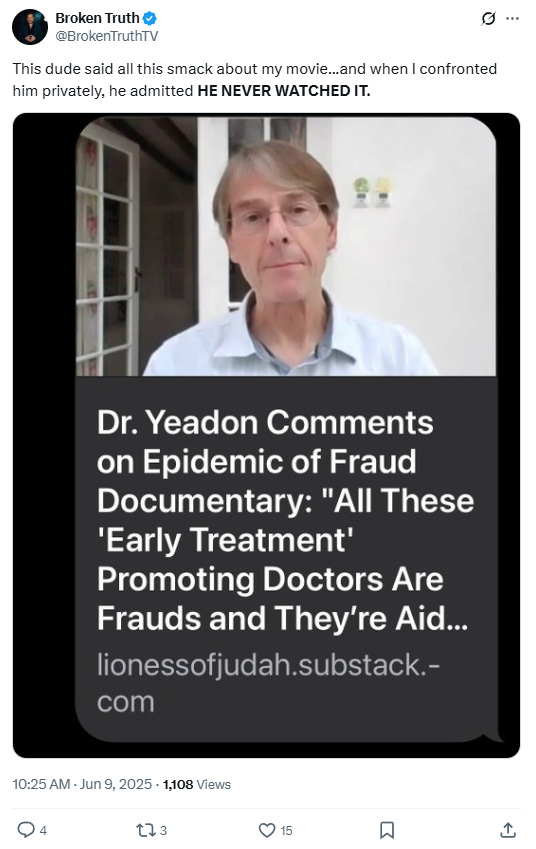 Broken Truth’s John Davidson found the same thing4 when Yeadon slandered his documentary “Epidemic of Fraud”5 without even watching it: Yeadon talks with great confidence about subjects he knows nothing about.