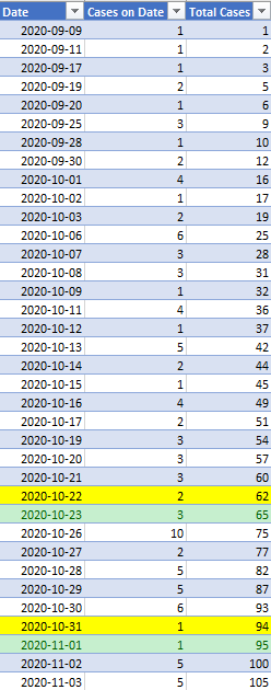 As you can verify, 62 cases were indeed accrued on October 22. Let’s admit a day of lag, they knew it by October 23.