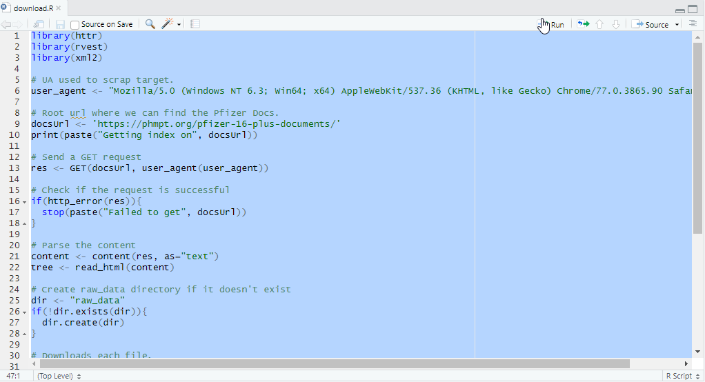 1. In R studio, open “download.R” by clicking on it (single click is sufficient) in the bottom right section.