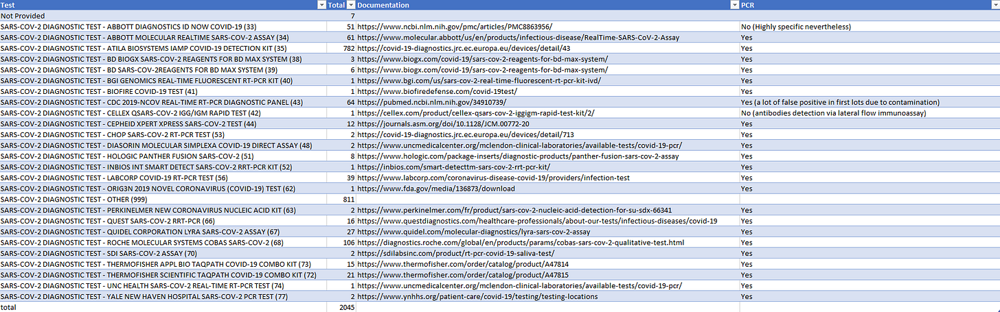 For researchers interested in independently reproduce our results, this “DI File” file contains, like the “MB File”, an ‘SPDEVID’ column which allows translation of the numerical code, indicated in some ‘SPDEVID’ entries (the rows which have the ‘MBTEST’ value set to “SEVERE ACUTE RESP SYNDROME CORONAVIRUS 2”) in the MB file. This allows us to assert with confidence that these tests, further documented thank to Geoff Pain21 in the following Google Spreadsheet22, are for a vast majority the local PCRs recorded. In some rare other cases other detection means than PCRs was used as detailed in the table below.