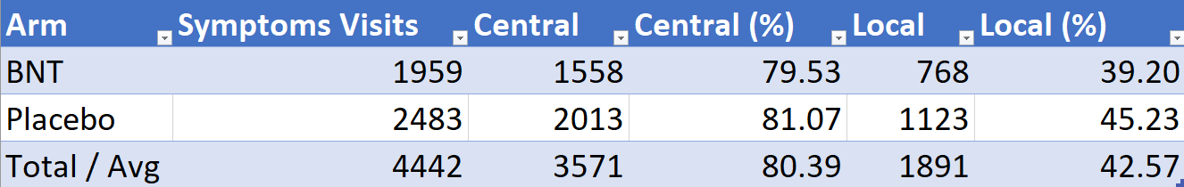 Otherwise said, swabs were collected and tested centrally 80.39% times when symptoms were reported in association with a “Covid visit” (79.53% for BNT, 81.07% for Placebo).