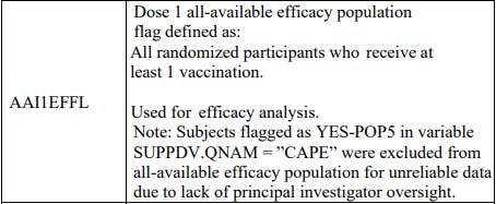 The ADRG3 file documents, page 16, the “suppdv” table as containing a relevant tag to identify the “Dose 1 eligible efficacy population”.
