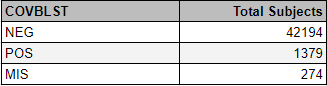 - 2. Timing of Tests: The COVBLST tag is determined on Positive tests based on tests conducted on or before the first day of the study (mbdy<=1 and isdy<=1). If the tests were conducted after the first day, the results would not be considered in determining the COVBLST tag and essentially treated as missing.