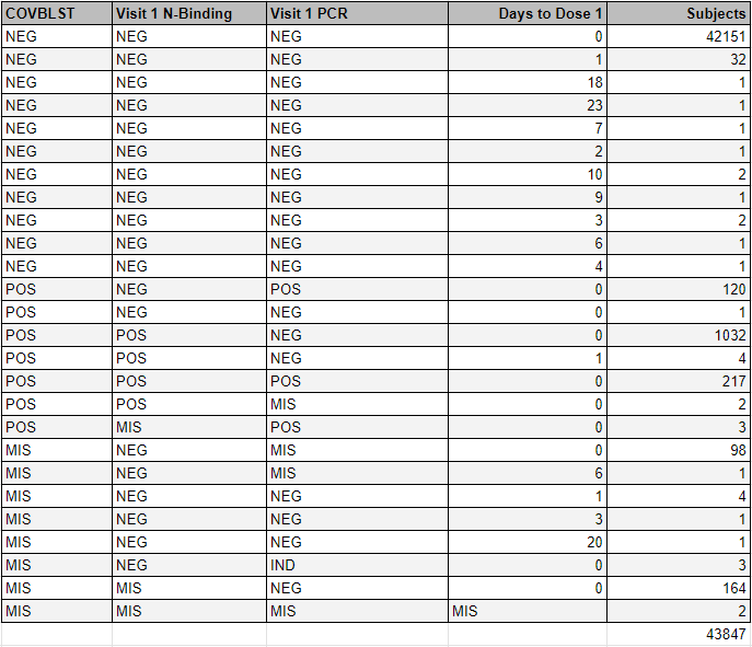 The distribution of the possible values for V1 N-Binding, PCR, and COVBLST status, is represented in the table below. The visit 1 tests are merged and normalized using this second script; and the distribution on the safety population, along with the subsequent analysis, are generated by this third.