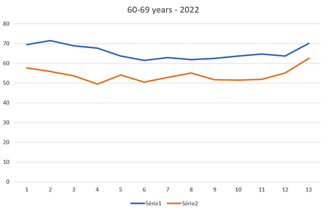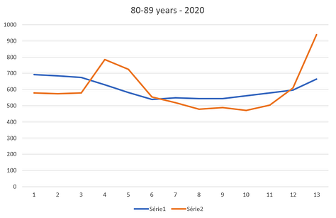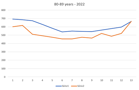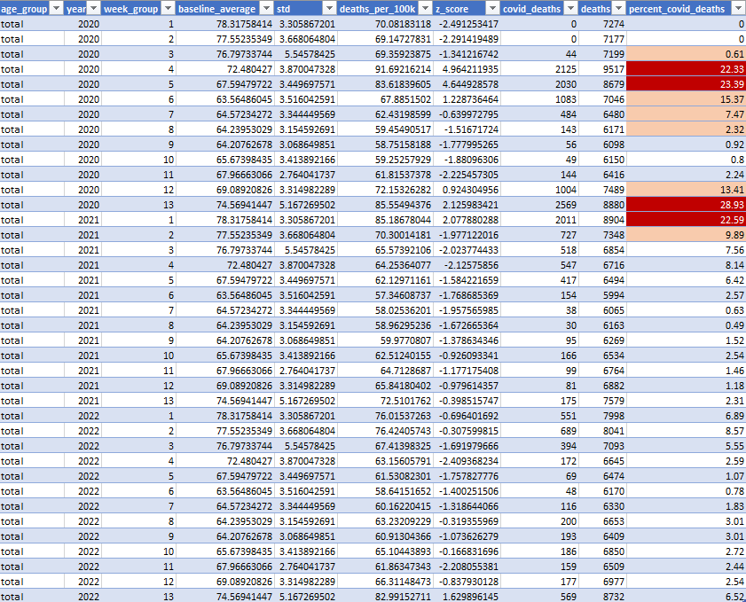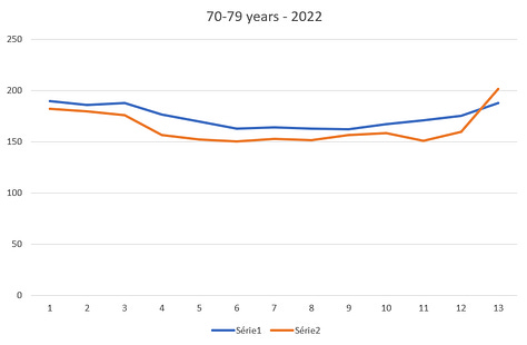We grouped the 52-53 weeks of deaths data, available on each year, in 13 groups of 4 weeks (a fifth was included in “week group 13” when 53 weeks in a year), and measured the z-score on each variation in deaths of 2020, 2021 & 2022 against the 2010-2019 baselines.