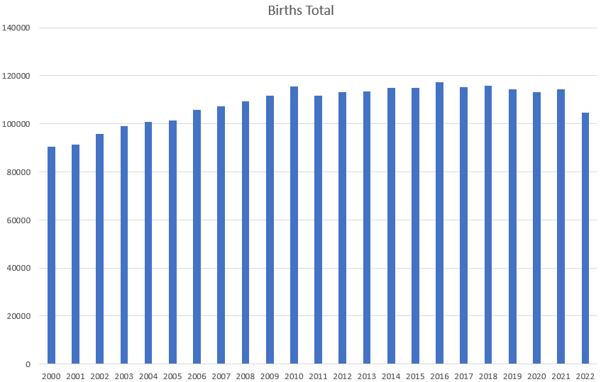 We mentioned a small issue above in relation to the year 2022. We had an average of 114,715 births per year between 2010 & 2019.