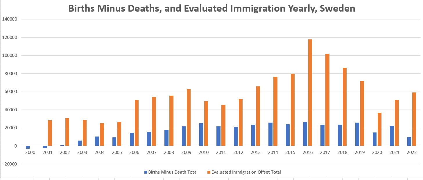 We can also chart the total of births & deaths each year, along with the population offsets with the former year, which gives us a good idea of the positive addendum of the immigration to the Swedish population (“population offset to last year - (people born this year - people dead this year) =~ official immigration”).