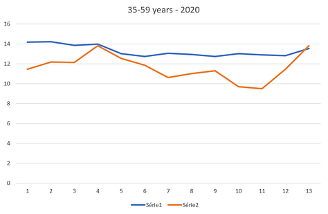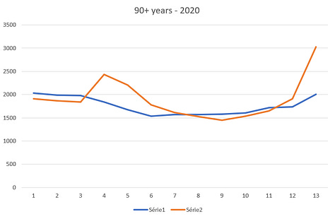 The values14 were quite puzzling, as the COVID pandemic itself was “less visible” than in other countries. We therefore produced another view on the total deaths, along with the percentage of deaths “attributed to COVID” according to the official figures.